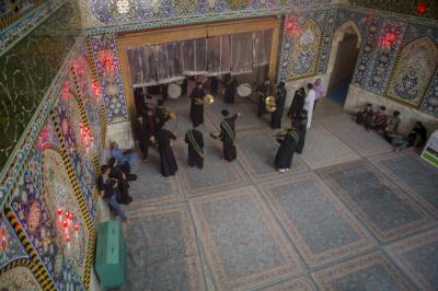 The procession consists of two parallel lines of mourners wearing black cloths, led by young men bearing white and colored flags, and others carrying a banner of the name of the procession, including the drummers, and those playing damams with curved sticks and those with copper cymbals, as well as percussionists that harmonize the horns' sounds, and unite the movement of the Zinjeel procession members, who turn half circle with the sound of the Radood accompanying every procession and who is reciting poems about Ashura tragedy, and the iron Zinjeel are rise to the top and then hit the back uniformly.