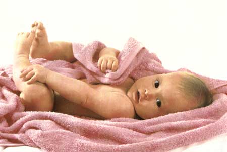 العشرين كيلو غراماً ، ومرمياً في عالم بارد ( 20 درجة مئوية عوضاً عن 37 ) . إضطرّ أن يتنفس بلحظة واحدة : يندفع الهواء إلى رئتيه الحديثتي العهد ، فاتحاً بعنف ألف حويصلة رئوية كما تتفتّح المظلة . يصرخ الطفل من الألم . بعدها يفحص بدقة ، يقاس وزنه ، أو يرجّح باليد ، يغسل ، يكسى ، قبل أن يخلد أخيراً إلى النوم ، مرهقاً من شدة التعب .