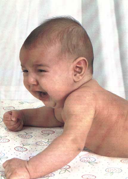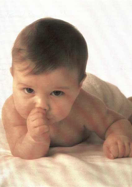| الشهر الخامس : | يشرّع في الصراخ ليلفت الانتباه إليه بدلاً من البكاء . يلتقط العابه ويجلس مستنداً إلى ذراع أمه . |