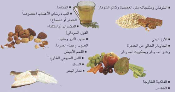 | إن المأخوذ الملائم من السوائل أساسي لعمل الأمعاء بشكل صحي . يفضل شرب المياه العادية على المرطبات التي أضيف اليها السكر أو الكافيين . | إن الألياف الموجود في الفاكهة والخضار مفيدة جداً للمصابين بتناذر الأمعاء المهتاجة . |