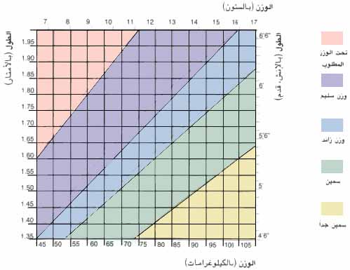 | دون الوزن المطلوب نادراً ما يكون الوزن دون المطلوب مشكلة ، ويمكن ربطه بمرض مزمن أو خلل في الأكل . والواقع أن الوزن دون المطلوب يعرّض صاحبه بدرجة أكبر للأمراض . الوزن السليم إن كنت تقع ضمن هذه الفئة ، يكون وزنك مثالياً وعليك الحفاظ على هذا المستوى في السنوات القادمة . الوزن الزائد قد يواجه الأشخاص المنتمين الى هذه الفئة العديد من المشاكل الصحية . ثمة خطر معتدل لمرض القلب ولا بد من اتخاذ الاجراءات لتخفيف الوزن في المدى الطويل . السمنة تترافق السمنة عادة مع اعتلال في الصحة ، ويتعرض كل شخص واقع ضمن هذه الفئة للعديد من الاضطرابات . يجب اتخاذ إجراءات لتخفيف الوزن على الفور . السمنة المفرطة في هذه الحالة يكون الشخص معرضاً كثيراً للخطر وعليه اتخاذ إجراءات فورية للتخلص من الوزن تحت إشراف طبي . |