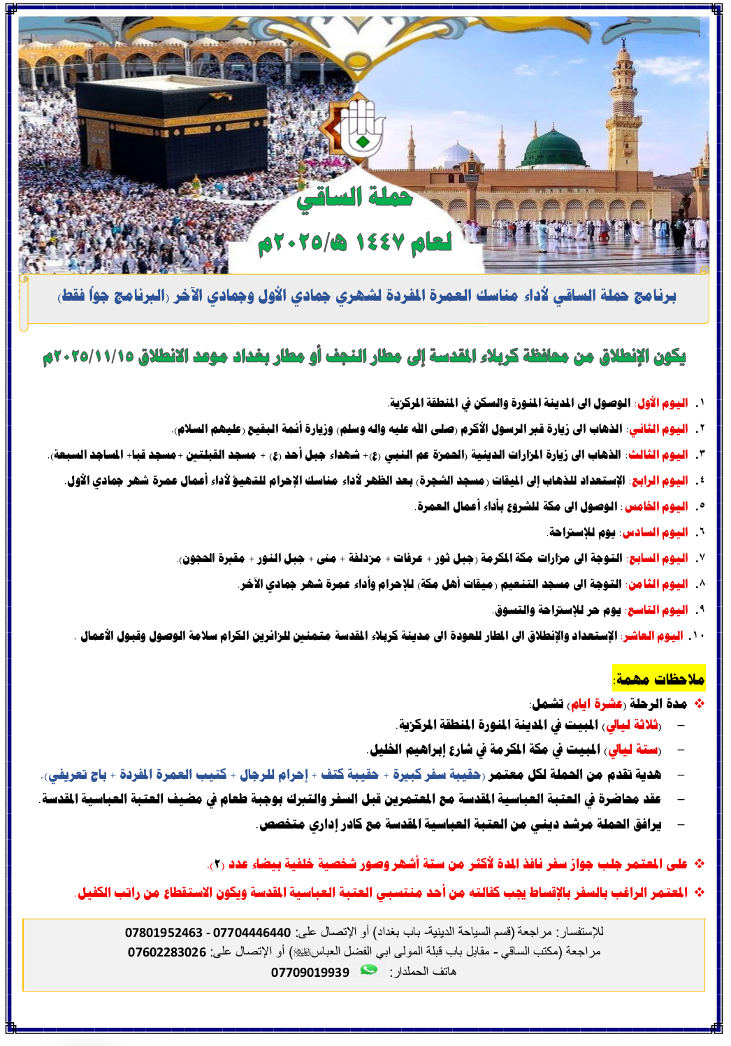♦️ تعلن #حملة_الساقي التابعة الى #العتبة_العباسية_المقدسة قسم السياحة الدينية عن برنامجها لاداء مناسك العمرة المفردة