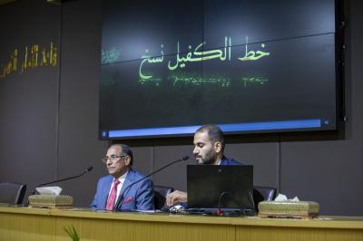 وقدّم الجلسة التعريفية كلٌّ من الخطّاط في قسم الخط العربي والزخرفة في كلية الفنون الجميلة بجامعة بغداد الدكتور حسين علي جرمط، وأحد ملاكات المجمع العلمي المهندس حسين علي خضر.
