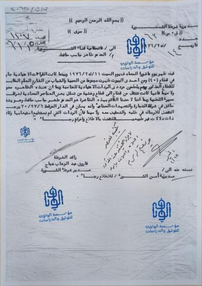 وتطرّق سماحته لإحدى الوثائق المؤرّخة في (السبت 11 كانون الثاني 1976)، بالتزامن مع ظهيرة يوم عاشوراء، عندما خرج مجموعةٌ من الصبية والشباب من أحد البيوت للسيد (طاهر جاسب حافظ) الذي كان يعمل حينها سائقًا في شركةٍ للتجارة والتعهّدات الصناعية، في قطّاع 40، وهم يلطمون مردّدين الردّات الاعتياديّة للمناسبة، إذ طالبت الوثيقة بالتحقيق معه بسبب تلك الردّات، وأرسلوا إليه وأجبروه على كتابة تعهّدٍ بعدم الإخلال بالنظام، لافتًا إلى أنّ مَن رفع التقرير شخصٌ يعمل رائدًا في الشرطة يُدعى (فاروق عبد الوهاب اعجاج).