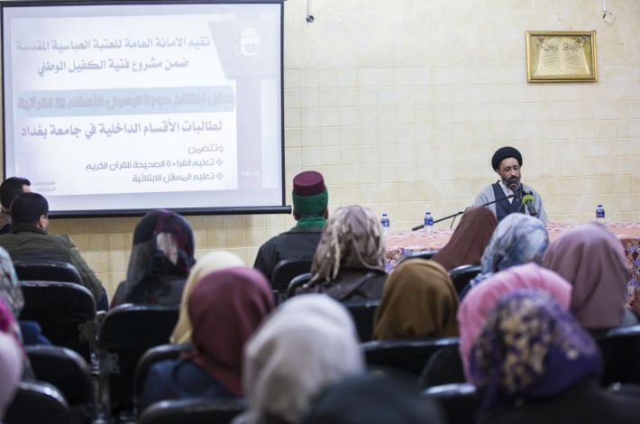 ضمن مشروع فتية الكفيل الوطني افتتح قسمُ العلاقات العامّة في العتبة العبّاسية المقدّسة (شعبة العلاقات الجامعيّة) دورة الرسول الأعظم(صلى الله عليه وآله وسلم) القرآنية المخصّصة لطالبات الأقسام الداخليّة في جامعة بغداد، التي يتضمّن منهاجُها تعليم القراءة الصحيحة للقرآن الكريم، وتعليم المسائل العقائديّة والابتدائية التي تتعرّض لها الطالبات خلال فترة دراستهنّ والعمل على تجذير ثقافة القرآن الكريم وتأصيلها.