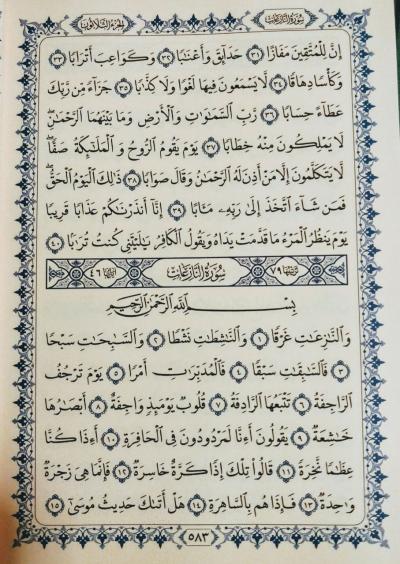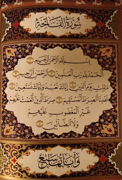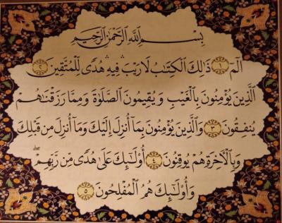 1- زخرفةُ الصفحة الأولى التي توضع فيها سورةُ الفاتحة وزخرفة الصفحة الثانية التي توضع فيها بدايةُ سورة البقرة، مع الأخذ بعين الاعتبار شكل وترتيب سورة الفاتحة كما هو موضّح في الصورة الملحقة، وأن تكون مساحة السورة كبيرةً حتّى تكون الكلمات واضحةً للقراءة.