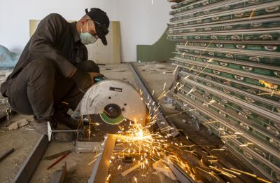 - أعمال التقطيع الحديديّة تمّ الانتهاء منها بالكامل تبعاً لقياس كلّ غرفة، والتي تبلغ مساحتها (5م × 3م).