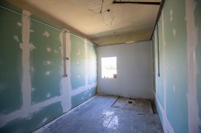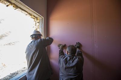وأوضح: "بعد الانتهاء من فتح منافذ خاصّة لشبابيك الغرف تمّت المباشرة بتثبيت (الفريم) المعدنيّ الحاضن للشبّاك، وقد تمّ الانتهاء من أغلبها".