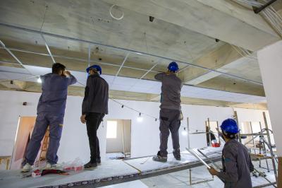 - أعمال تثبيت مقاطع (الجبسن بورك) على قطع (السندويج بنل) مع تسوية سطحها وصبغها، وصلت نسبة الإنجاز فيها الى (85%).