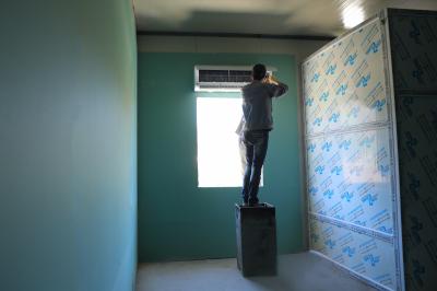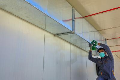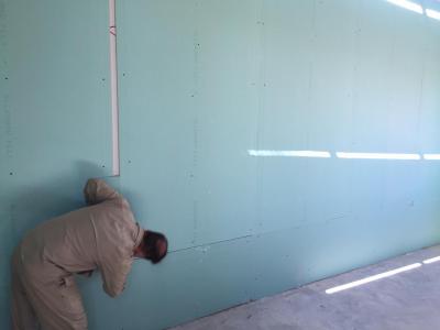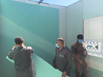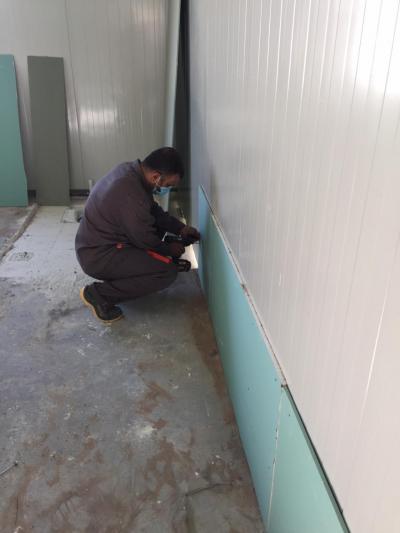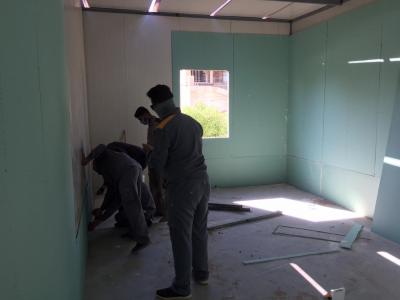 - تغليف الجدران بالقواطع العازلة من مادّة الجبسن بورد، وقد وصلت نسبة الإنجاز الى أكثر من 80%.