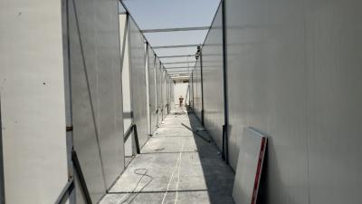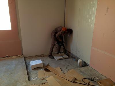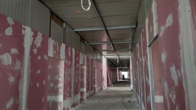 - الجزء الثاني الذي تبلغ مساحته (1377) متراً مربّعاً أيضاً ويضمّ (56) غرفةً مفردة (سويت)، يشهد أعمال تغليف القواطع العازلة (جبسن بورد) وتُجرى معها بالتوازي أعمال تثبيت قطع التبريد الخارجيّة (سبلت يونت) وأعمال التسليكات الكهربائيّة، مع المباشرة بإكساء أرضيّة المجموعات الصحّية الخاصّة بالغرف، ووصلت نسب إنجاز تسليكات المجاري فيها الى مراحلها النهائيّة.