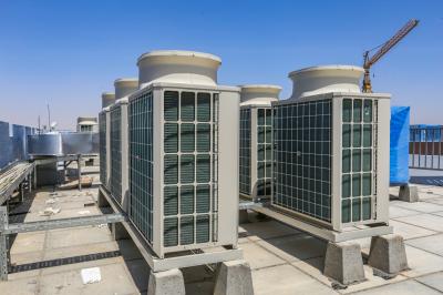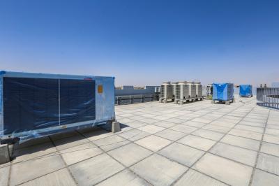الثالثة: منظومة التهوية وهي من نوع (DX unit) إيطاليّة المنشأ، ووصلت نسبة إنجازها الى أكثر من 95% لجميع أبنية المشروع".