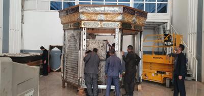 بعد الانتهاء من صناعتها: المباشرةُ بتركيب أجزاء وقِطع شبّاك مقام الكفّ في مصنع شبابيك الأضرحة