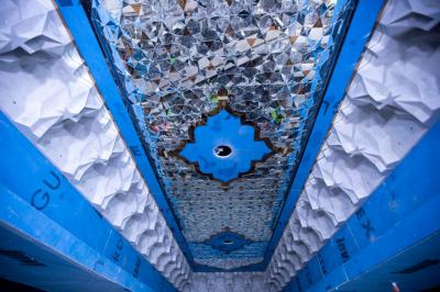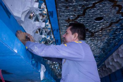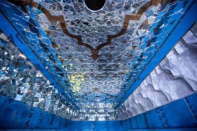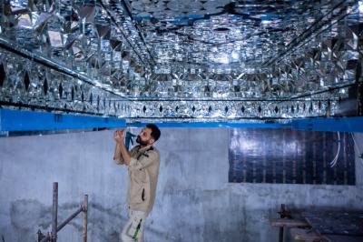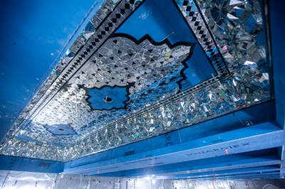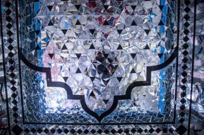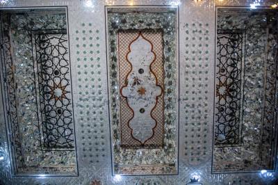 وبيّن الصائغ أنّ "الزجاج المُستخدَم في أعمال التغليف هو من النوعيّات ذات المواصفات عالية الجودة ويصل سُمْكُه إلى (2ملم)، ويمتاز بثبات لونه ومقاومته لأقسى الظروف، ويحتاج إلى وقتٍ لأنّ أعماله مقترنةٌ بالدقّة والحرفيّة، تبعاً لتصاميم وقياساتٍ وأحجامٍ وأشكالٍ مختلفة فضلاً عن كثرة النقوش وتعقيداتها الفنّية، وتُجرى أعمالُ لصقه على السقوف يدويّاً باستخدام موادّ صمغيّة خاصّة، تحتاج إلى حرفيّةٍ في التعامل معها".