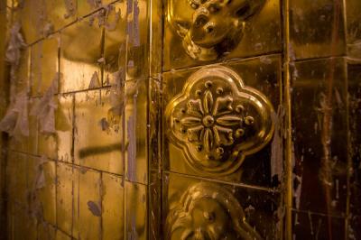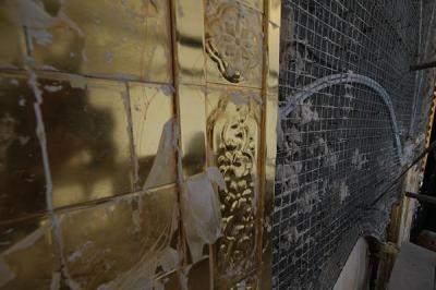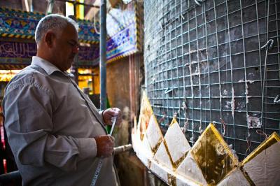 It is worth noting that in the gilding operation, the 24 carat gold was used in different sized and with a weight of 10 grams of pure gold for each gold tile, which thickness is of 2mm, using the best techniques by hammering on the suede leather. each fabricated tile is subject of standardization testing and quality control in the Planning Iraqi Ministry. there will be also the use of fonts, motifs and Quranic verses inscribed on the gold mixed with the warm enamel, which is considered one of the finest enamel that interact with copper, and characterized by its resistance and brilliance, using the modern technique of linking these gold tiles by screws, to not affect its outside appearance.