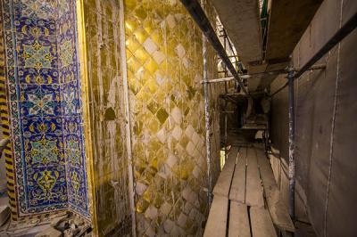 In the midst of the ongoing projects set up by the technical and engineering staff of the Al-Abbas's (p) holy shrine, which aim to server the visitors with the best of means. And for the purpose of giving the aesthetic aspect to the holy shrine, to maintain its architectural facilities and to preserve the architectural heritage with a modern aspect and high durability and efficiency, the first part of the project to strengthen, develop and gilding the Iwan's dome at the Al-Abbas's (p) holy shrine was completed according to the technical and engineering plans that were approved, this Iwan is located at the left side of the main entrance of the holy shrine from the side of the gate of Al-Qiblah, the completed area is approximately 100 m2, and immediately upon the completion of works, which is completed in record time, the works in the second part will start, at the right side of the holy shrine entrance.