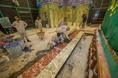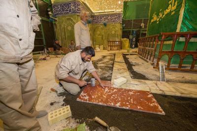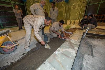 أعمال تركيب هذه البلاطات المرمريّة سبقتها أعمال عديدة منها أخذ القياسات للمساحة المراد إكساؤها التي بلغت (120) متراً مربعاً والتي تحيط بالشبّاك الشريف من جهاته الأربع وصولاً الى أبواب الحرم المطهّر من الداخل، من ثمّ رفع المرمر القديم والمباشرة بأعمال تسوية الأرض وأخذ درجة ميلانها وارتفاعها وموازنتها تبعاً لأرض الحائر والصحن الشريفين.