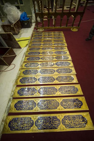 وقد نُقِشَت هذه الأبياتُ على كتائب معدنية مصنوعة من النحاس بسُمْكِ (7ملم) وارتفاع (18سم) وطُليت بالذهب والمينا الزرقاء بطريقة حرفيّة وفنية، واستُخْدِمَ فيها خطُّ الثلث المركّب بطريقةٍ مفتوحة وسهلة للقراءة، حيث قام بهذه المهمّة الخطّاط الدكتور روضان بهية.