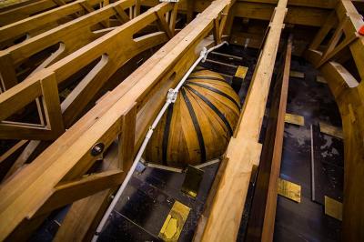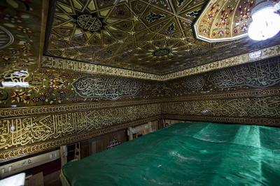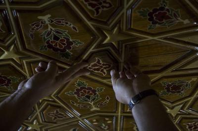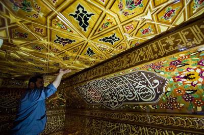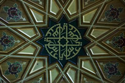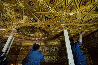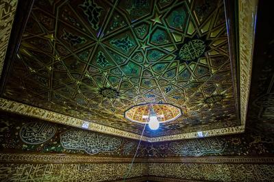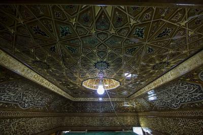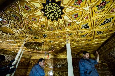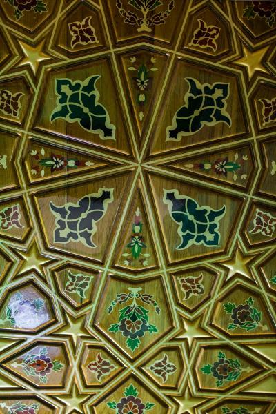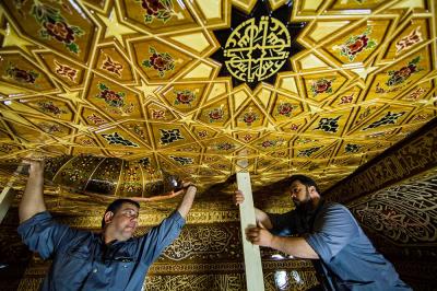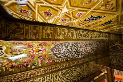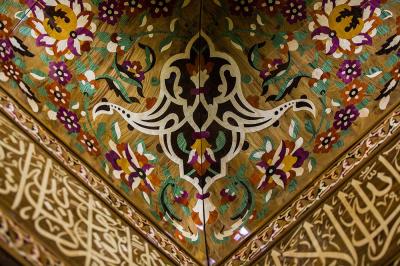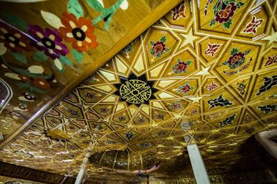 صُنِعَ السقفُ وشُكّل بنقوشه وزخارفه وتطعيمه وتعريقه بها دون استخدام أيّ ألوانٍ أو أصباغٍ بل اعتُمِدَ على ألوان الخشب الطبيعيّة الذي استُورِد من مناشئ عالمية بمواصفاتٍ وجودةٍ عاليتين، ومن ألوانه: الخشبُ الأبيض بتدرّجاته والأصفر والأخضر والأسود والبنفسجي والأحمر والساجي، أمّا أنواعه فكان من خشب الساج والبلّوط والزان والنارنج والسيسم والجاوي والسنديان والجوز، وقد استُخدِمَت جميعُ أنواع هذه الأخشاب وفقاً لنسبٍ وقياساتٍ خاصّة أُعِدَّت مسبقاً لإنجاز هذا العمل المبارك.