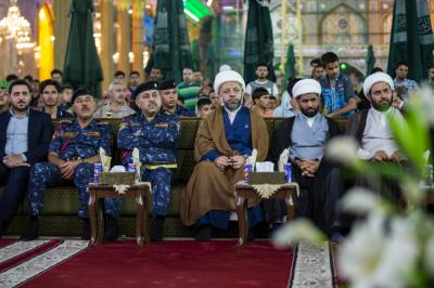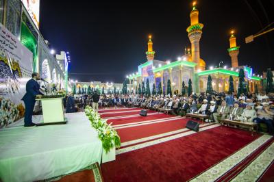 وأضاف قائلاً: "ونحن نحتفلُ في هذا اليوم الأغرّ، والأفراحُ تملأُ فضاءَنا، يزدانُ فرحُنا بالمسرّات ونحن نفتتحُ شبّاكي الولاء، الأوّل: للشيخ المفيد وأستاذه ابن قولويه(رحمهما الله)، والثاني: للشيخ الخواجة نصير الدين الطوسي(رحمه الله)، بما يستحقّانه ليُزيّنا مرقدَيْهما، ويُدخل السرور على صدور المؤمنين، وقد تمّ صنعُهما على نفقة العتبة المقدّسة في مصانع السقّاء التابعة للعتبة العبّاسية المقدّسة".