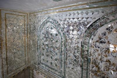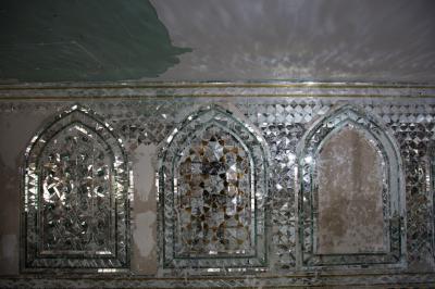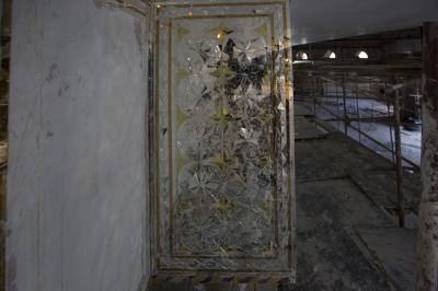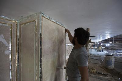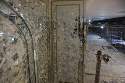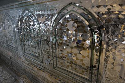 - Die Installation von künstlerisch geschnitten Spiegelstücken an Decken und Wänden der Hallen