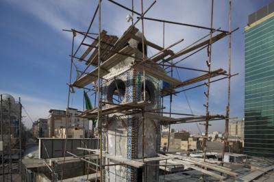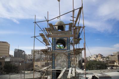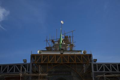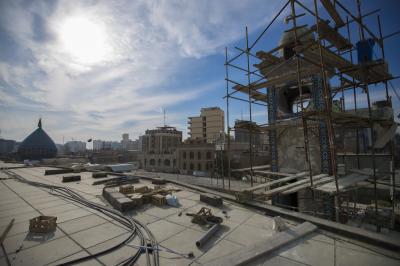 - Fortsetzung der Arbeit am Haupteingang des Maqam, die ein großes Tor in der Mitte des alten Eingangs von außen und ein weiteres von außen einschließt, auf dem eine Tarma mit einer Breite von über vier Metern installiert ist mit Säulen an den Seiten in Iwan-Form, die mit gestreiftem Kashi Karbalai verziert werden. Es wurden Eisenkonstruktionen in die Arbeiten inkludiert, die zu den neuen Ergänzungen dieses Projekts gehören.