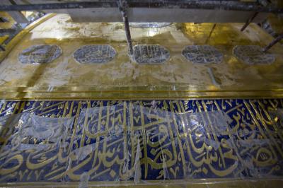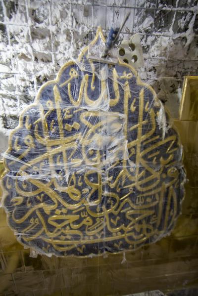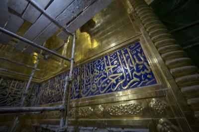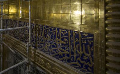 فبعد أن تمّ الانتهاء من تركيب الكتائب القرآنيّة التي توسّطت مدخل الطارمة وما تبعها من أعمال إكساء أخرى، تمّ الشروع مؤخّراً بتثبيت أسماء أصحاب الكساء(عليهم السلام) بدءً من الرّسول الأكرم(صلّى الله عليه وآله) وانتهاءً بالإمام الحسين(عليه السلام)، حيث خُطّت داخل طرّةٍ (شكل أشبه بالبيضويّ) ذي أرضيّة زرقاء من المينا، وخُطّت بخطّ الثلث الجلي المشبّع ووُزّعت بطريقةٍ متساوية، واعتلت هذه الأسماء المشرّفة وفي منتصفها الآية القرآنيّة (رَحْمَتُ اللَّهِ وَبَرَكَاتُهُ عَلَيْكُمْ أَهْلَ الْبَيْتِ إِنَّهُ حَمِيدٌ مَّجِيدٌ) وأيضاً خُطّت بخطّ الثلث المشبّع وبشكلٍ كمّثريّ ذي زخارف وأرضيّة زرقاء (مينا)، وتُحاط هذه المخطوطات بقوسٍ كبير قاعدته ترتكز على شريطٍ متّصل بالكتائب القرآنيّة، ونهايته المدبّبة تتّصل بأقواسٍ وزخارف أخرى.