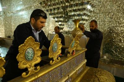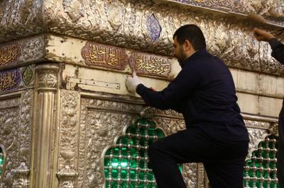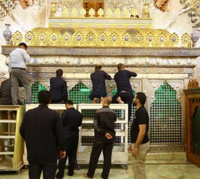 The technical and engineering staff working in al-Saqqa factory for the manufacture of grids and doors of shrines and sanctuaries of the al-Abbas's (p) Holy Shrine began the first phase of the maintenance and re-gilding of the upper parts of the holy grid for the two imams al-Kadhem and al-Jawad (peace be upon them).