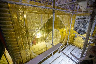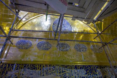 مبيّناً: "إنّ أعمال الإكساء جاءت بصورةٍ تسلسليّة من الأسفل الى الأعلى، وقد تمّ الوصول الى جزءٍ مهمّ من أجزاء الإكساء ألا وهو إكساء السقف بالبلاطات الذهبيّة، الذي مزج فنّ المعرّق فيه بين جماليّات النقوش والزخارف الإسلاميّة بألوانها المتناسقة، ليُضفي لمساتٍ جماليّة جمعت بين العراقة وحداثة التصميم وبنقوشٍ إسلاميّة متناسقة تتلاءم مع رونق وبهاء هذه الإيوان".