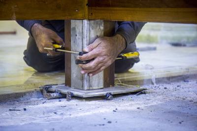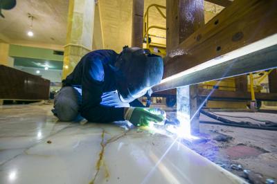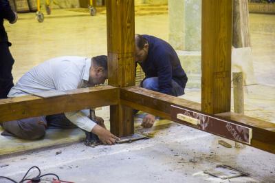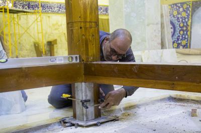 المُشرف على أعمال النجارة المهندس علي سلّوم بيّن لشبكة الكفيل: "تمّ إسناد الأعمدة الركنيّة الأربعة للهيكل الخشبيّ على أربع قواعد من الحديد الاستنلس استيل، التي شكّلت بنفس شكل قاعدة هذه الأعمدة فأصبحت على شكل حواضن لها ورُبطت معها، أمّا الأعمدة الوسطيةالتي يبلغ عددُها عشرة أعمدة والتي تربط بين المشبّكات (الدهنات) الجانبيّة، فقد تمّ تعشيقُها كذلك بقواعد من الحديد الاستنلس استيل أيضاً، وهذه القواعد وُضعت في أوضاعٍ قياسيّة ركّبت مع حديد التسليح في الأُسس الخرسانيّة التي جُهّزت في وقتٍ سابق، ورُبطت بطريقة اللّحام بمادّة (البراص) بعد أن تمّ إسنادها على دعاماتٍ حديديّة لترتبط جميعها معاً، ولتكون جميع هذه الأعمدة مع كافّة ملحقات الهيكل الأخرى كقطعةٍ واحدة، وهذه العمليّة هي تمهيدٌ لعمليّات تركيبيّة أخرى تأتي تباعاً".