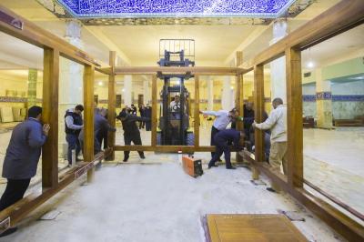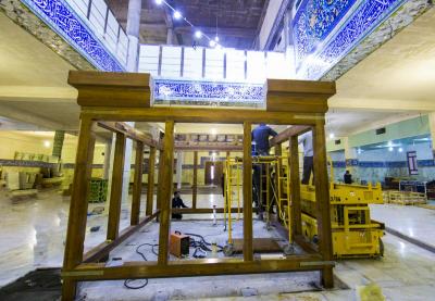 (10 Joumada II AH) correspondant au 5 Février 2020, le personnel artistique a achevé une étape importante de l’érection de la structure en bois, qui installe et fixe ses piliers principaux et latéraux et les fixe au sol en béton qui leur est attribué, après que toutes les considérations techniques et d'ingénierie ont été prises pour installer ces pièces importantes .