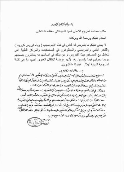 Le bureau de Sayed Sistani a rendu l’avis de l’Autorité religieuse suprême en réponse à une question sur les efforts du personnel médical qui s’occupe des patients atteints du Covid 19.
