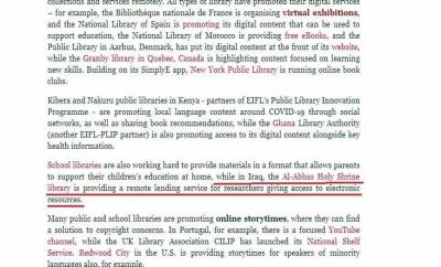 Infolgedessen lobte die Internationale Föderation der Bibliotheksverbände und -institutionen IFLA, zu deren Mitgliedern mehr als 150 Länder gehören, darunter der Irak und die Bibliothek der Heiligen Abbassitischen Stätte diese Maßnahmen der Bibliothek und ihren Beitrag zum Dienst des Lernens und der wissenschaftlichen Forschung, um das Lernen und Forschungsrad nicht anzuhalten im Lichte der aktuellen Lage durch die Ausbreitung der Corona-Pandemie.