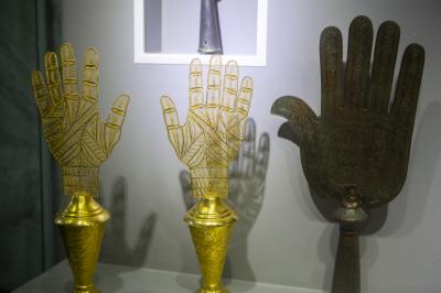 وأشار: "أهمّ ما موجود لدينا من هذه التُّحف الفنّية هو زوجان من الكفوف مصنوعان من الذهب الخالص المحلّى بالألماس، وهما قديمان إذ يعود تاريخهما الى أكثر من 100 عام".