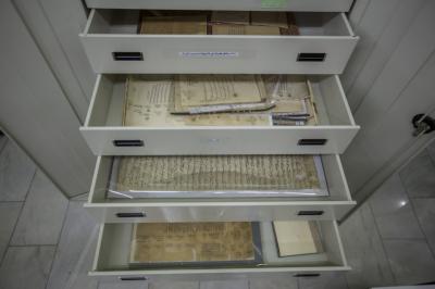 وبيّن لطفي: "انّ توزيع الدواليب أو الخزانات الخاصّة بالحفظ كان حسب خطّةٍ استُثمِرت فيها مساحةُ الخزن، وضمن تبويباتٍ خاصّة أي الوثائق على جانب والمخطوطات على جانبٍ آخر، فضلاً عن وجود عارضاتٍ زجاجيّة (فاترينات) وُضعت فيها نماذج من تلك المخطوطات والوثائق".