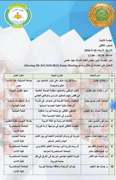 Mittels die Zoom Meeting-Plattform konnte eine Gruppe von Wissenschaftlern und Forschern aus dem In- und Ausland teilnehmen, darunter einige Mitarbeiter der Bibliothek und des Manuskripten-Hauses des Heiligen Abbassitischen Stätte. Beide waren: