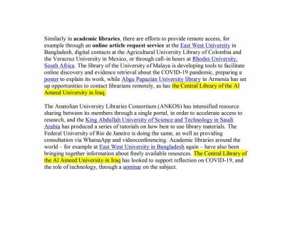 “Uluslararası Kütüphane Dernekleri ve Enstitüleri Federasyonu (IFLA) bu veriler ve etkinlikler ışığında üniversitemizin kütüphanesini en son yayınladığı rapora dahil etmiştir. “Uzaktan hizmet yönetimi” adlı raporda pandeminin tehlikesinin azaltılmasına katkıda bulunan ve bazı aktivitelerini kesintiye uğramaksızın devam ettirebilen kütüphanelere yer verildi.”