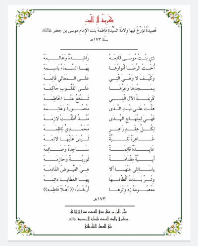 يا بِنْتَ مُوسَى وَابْنَـةَ الأَطْهــارِ أُخْتَ الرِّضـا وَحَبِيبَةَ الجَبَّــار