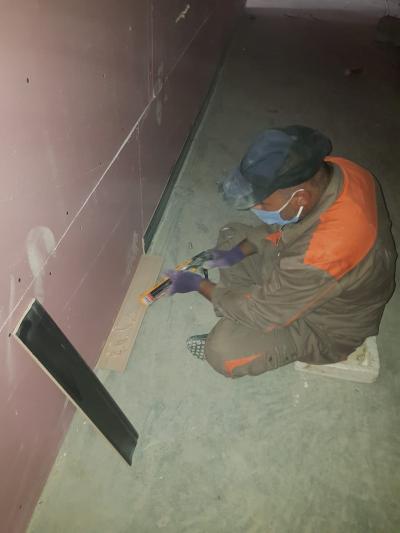 -Arbeiten an der Abdeckung des Bodens des Sanitärsets für jeden Raum und Arbeiten an der Fertigstellung der Sanitäranlagen für die verbleibenden Räume.