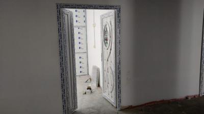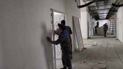 -تثبيت أبواب غرف البناية بعد أن تمّ إنجازها في ورش القسم.