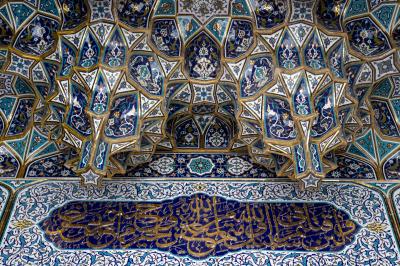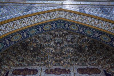 - The ceiling includes many vegetable inscriptions, ornaments and Muqarnas (which resemble beehives). They are decorated with streaky vegetal inscriptions and drawings inspired by the inscriptions of the Holy Shrine, and are framed with gilded frames according to the design of each part, as they were distributed over all areas of the upper ceiling of the gate.