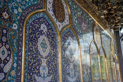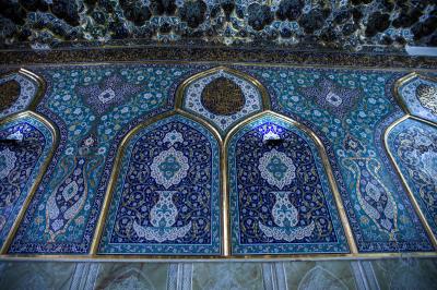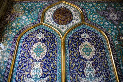 - The wall of the gate is decorated with inscriptions and decorations consisting of six large arches framed by a golden frame, containing inscriptions and ornaments inscribed on the Kashi Karbalai and based on other alabaster inscriptions and motifs, and these arches are surmounted by other arches resting on the top of their pyramid, making three arches that are also framed by a pure gold frame that contains an ornate ribbon and a Qur’anic inscription. The top of this arch is attached to a gilded frame surrounding the ceiling of the door from the inside, and between its upper and lower parts there is a gilded Qur’anic inscription. And these works are repeated on each side.