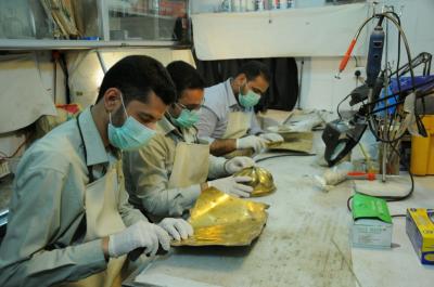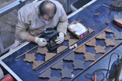 ثالثاً: صيانة المعدن تتمّ باستخدام الطريقة الميكانيكيّة أو اليدويّة، وباستخدام موادّ مخصّصة لهذا الغرض مع المحافظة على نقوشها وزخرفتها دون التأثير عليها، كذلك تتمّ أعمال تثبيت ما فُقِد من أجزائها بعد أن يتمّ تصنيع هذه الأجزاء تبعاً للقياسات المطلوبة".