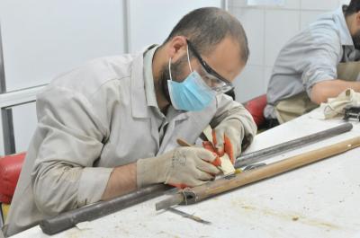 ثانياً: مراحل ترميم البدن الخشبيّ لكلّ قطعة سلاح، وتشمل تنظيف القطعة وفحصها مختبريّاً، من ثمّ الشروع بأعمال الترميم والاستكمال للكسر في البدن الخشبي إن وُجِد، وتدعيم القطع الصغيرة المكسورة في البدن الخشبي والأجزاء المفقودة منه، بعد أن يتمّ نحتُها حسب الشكل الأصليّ المفقود (اعتماداً على الطراز العام للبندقيّة)، ليتمّ بعد ذلك تركيبها على الجزء الأصلي.