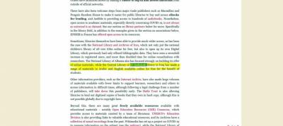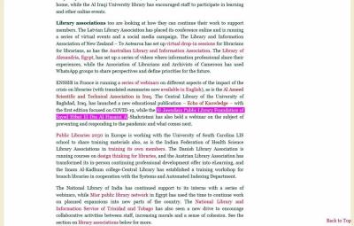 Il est à noter que la Fédération internationale des associations de bibliothécaires et des bibliothèques (IFLA) et depuis le déclenchement de l'épidémie de Coronavirus, a travaillé des statistiques par l'intermédiaire de ses membres répartis dans le monde entier dans des bibliothèques actives, lors de l'éclosion de l'épidémie qui a affecté le travail de bureau, elle a donc préparé des données spéciales par l'intermédiaire de la bibliothèque et de la maison des manuscrits du sanctuaire saint Al-Abbas, en tant que représentant officiel de la Fédération internationale, chargé de télécharger des données sur les bibliothèques en Iraq et les services qu'elles ont fournis pendant cette période, afin de les soumettre à son rapport périodique.