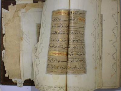 Herr Lutfi erklärte: „Nachdem die ersten Ermittlungsarbeiten an diesem Manuskript durchgeführt worden waren, wurde deutlich, dass der Umschlag von den Rändern angefressen war, dort waren auch viele Risse in der Dekoration, im Absatz des Buches und an einigen Stellen in der Dekoration abblätterten. Außerdem litten die Koranseiten unter Rissen und Brüche, die zum Verlust von Teilen des Manuskripts führten. Einige Papiere litten unter dem Anhaften aneinander, weil sie direkter Feuchtigkeit ausgesetzt sind, und dies war eine große Herausforderung für uns, aber unsere Mitarbeiter bestanden darauf, dass sie es restaurieren und pflegen und seine Pracht wiederherzustellen.