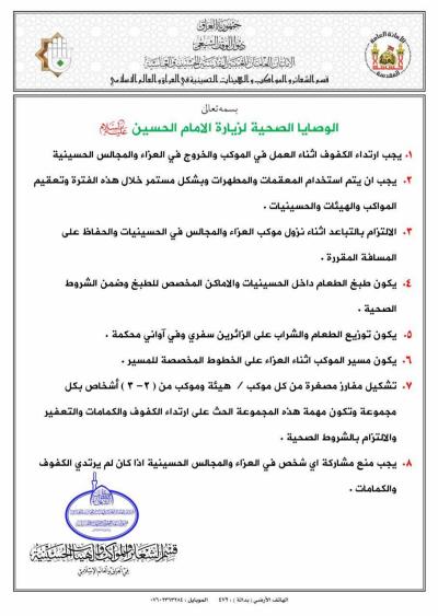 بخش شعائر وموکب های حسینی در عراق و جهان اسلام وابسته به آستان های مقدس حسینی و عباسی توصیه های بهداشتی ویژه دسته های عزادارای و موکب های خدمت رسانی به زائران اربعین امسال را صادر نمود.