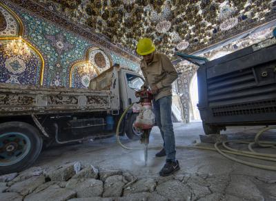 The head of the department, Eng. Dia Majid Al-Sa'egh, said: “The Qibla Gate is considered the main gate of the al-Abbas's holy shrine. After the completion of the modernization, expansion and development of its front façade and the completion of the Islamic decoration and inscriptions for the gate’s ceiling and walls, the cladding works of its floor has started by breaking and removing the temporary concrete covering it, then taking the necessary measurements in line with the height of the floor with the sanctuary and the entrances of the gate, as it will be cladded with a good quality alabaster.