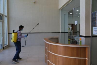 - القيام بأعمال تعفيرٍ وتعقيم مستمرّة حسب جدولٍ زمنيّ وُضع لهذه الأعمال، وباستخدام موادّ مرخّصة وذات فعّالية لتشمل جميع مفاصل الجامعة.