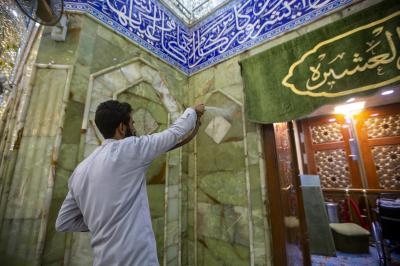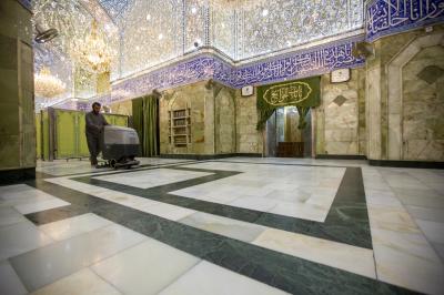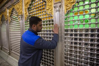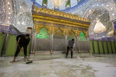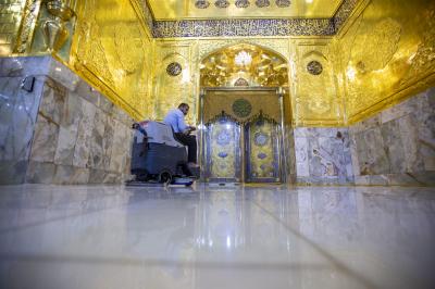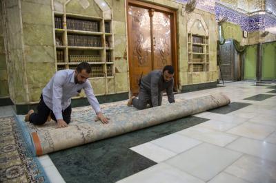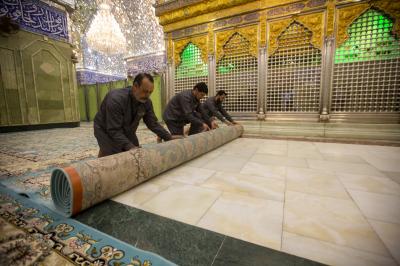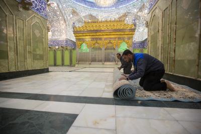 Le chef de la division, Haj Nizar Ghani Khalil, a expliqué au réseau al-Kafeel ce qui suit: «Ces travaux ont été réalisés hier soir après la diminution du nombre de visiteurs. Nous avons fermé le sanctuaire sacré et nous avons enlevé les vieux tapis, puis nous avons lavé le sol et les murs du sanctuaire sacré en partant de la grille sacrée jusqu'à l'Iwan doré en utilisant des agents de nettoyage spéciaux. "